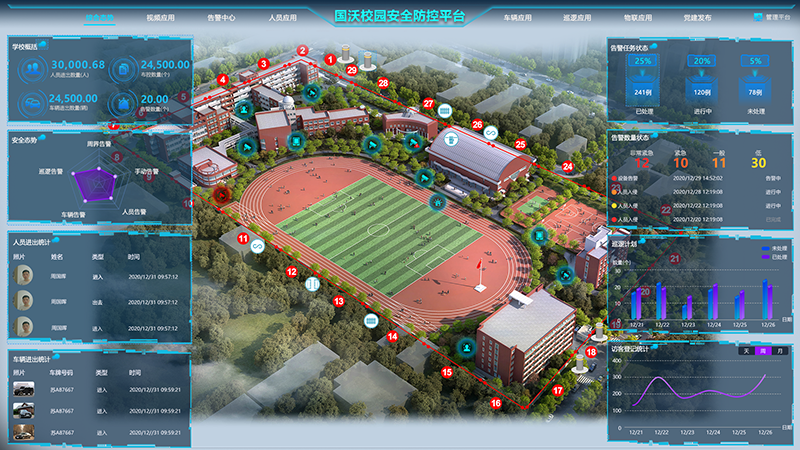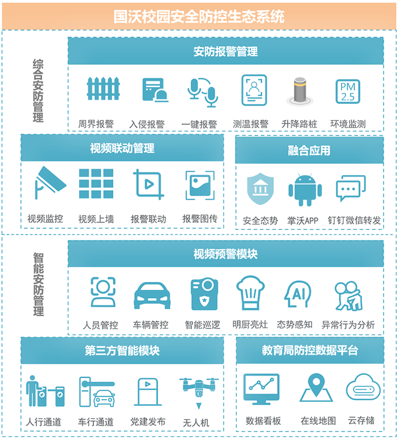 国沃依托于多年自主研发的硬件物联核心技术,在积累万级教育行业用户与百万级用户大数据后,融合AI、大数据、云服务等技术,推出适用于教育行业的校园安全防控平台系统,真正实现“事前智能预警、事发实时报警、事后科学评估”,打造全新校园安全防控生态系统,全力推动智慧校园××普及。